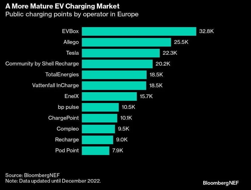 Rynek europejski jest bardziej zrównoważony, a różnica między trzema największymi operatorami ładowania pojazdów elektrycznych jest znacznie mniejsza niż w USA.
