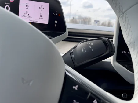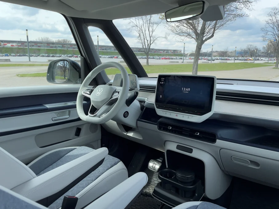 Wewnątrz znajdziemy charakterystyczną dla elektrycznej rodziny Volkswagena ID. Minimalistycznie zaprojektowaną deskę rozdzielczą wyposażoną w dwa wyłamujące się z prostej linii ekrany. Większość funkcji zabunkrowana została w centralnie umieszczonym wyświetlaczu obsługującym w tym przypadku system multimedialny VW ID. Software 3.2 (VW ID. Software 4.0 dostępny będzie w Buzzie prawdopodobnie w momencie rozpoczęcia produkcji wariantu z dłuższym rozstawem osi), któremu wciąż sporo brakuje do ideału, jednak widoczny jest progres względem poprzedniej wersji. Poza główny ekran wyciągnięte zostało zaledwie kilka funkcjonalności obsługiwanych za pomocą dotykowych (niestety), z niewiadomych przyczyn niepodświetlanych przycisków.