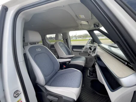 Jakość materiałów użytych do wykończenia wnętrza niekiedy potrafi niemiło zaskoczyć jednak mimo to są one przyzwoicie spasowane i nie hałasują podczas jazdy. Volkswagen chwali się również, że przy produkcji ID. Buzz-a na szeroką skalę wykorzystano materiały pochodzące z recyklingu. Przykładem takiego rozwiązania jest tkanina wykonana z przędzy, której włókna składają się w 10 procentach z plastiku zebranego w oceanach i 90% z PES, czyli recyklingowanych butelek PET. Próżno będzie szukać w kabinie ID. Buzza skóry, czy innych materiałów pochodzenia zwierzęcego.