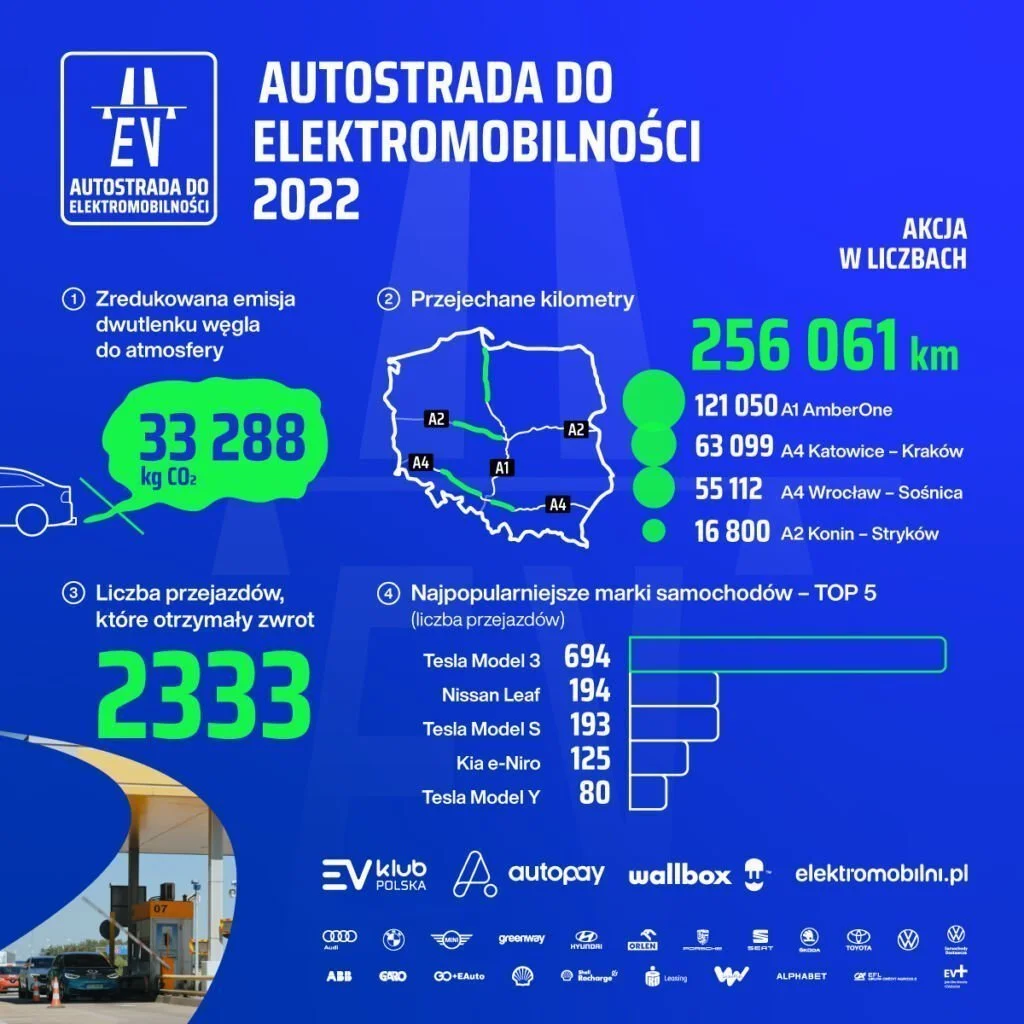 Od 4 lipca do końca wakacji, trwała II edycja kampanii „Autostrada do elektromobilności” przygotowanej przez EV Klub Polska, Autopay oraz Wallbox. W ramach projektu, kierowcy samochodów elektrycznych zostali zwolnieni z opłat za przejazdy wybranymi autostradami w Polsce. Łączny dystans pokonany za darmo przez użytkowników pojazdów zeroemisyjnych na Autostradzie A1 wyniósł ponad 121 tys. km. Z kolei na odcinku A4 Katowice-Kraków było to ponad 63 tys. km. Równie popularny okazał się drugi płatny odcinek autostrady A4 pomiędzy Gliwicami a Wrocławiem. Użytkownicy samochodów elektrycznych łącznie przejechali tam niemal 55 tys. km. Z kolei na najkrótszym odcinku A2 Konin – Łódź pokonany zeroemisyjnie dystans wyniósł ok. 17 tys. km. Z wyliczeń organizatorów wynika, że druga edycja kampanii pozwoliła na redukcję emisji CO2 o 33 288 kg.