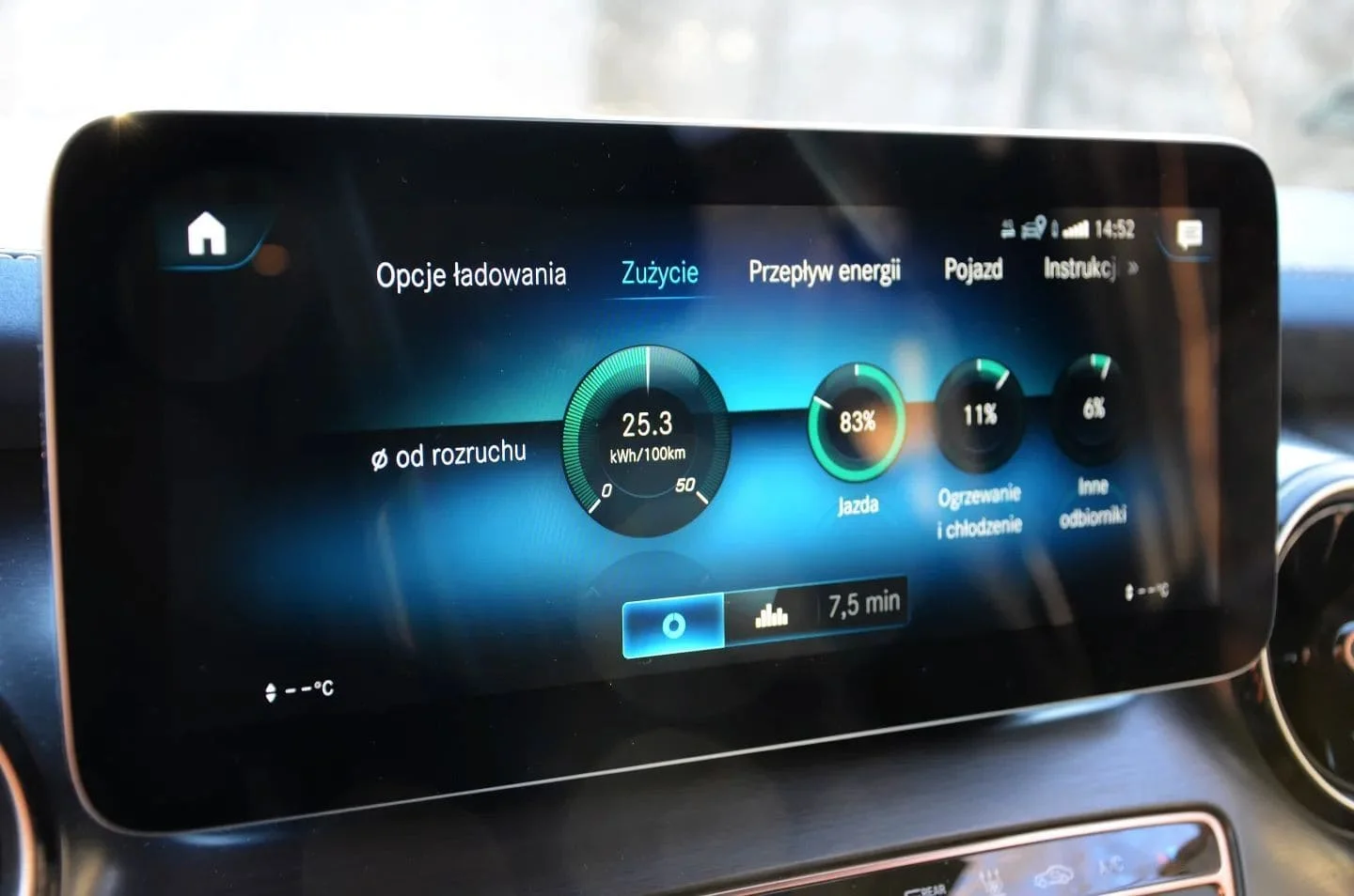 Masa – bo baterie sporo ważą. Ma to swój plus, bo auto jest dużo bardziej stabilne (nisko położony środek ciężkości), ale względem spalinowej Klasy V czuć, że hamulce przy mocnym hamowaniu muszą się więcej napracować.