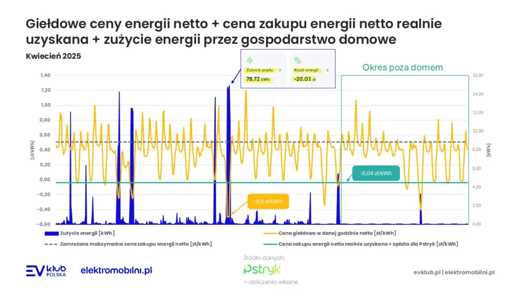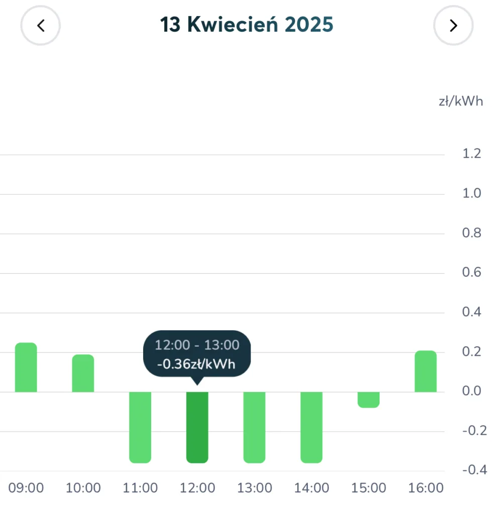 13 kwietnia, gdy cena energii na Rynku Dnia Następnego na Fixingu I na 4 godziny spadła do wartości -500 zł/MWh netto. Oznaczało to, że po doliczeniu kosztów przesyłu i opłat sprzedawcy moja realna stawka brutto wynosiła -0,36 zł/kWh.