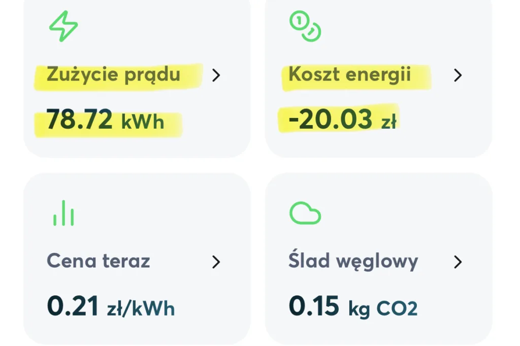 Tego dnia pobrałem z sieci niemal 79 kWh przy ujemnej cenie, co przełożyło się na -20 zł na rachunku (grafika poniżej). Naładowanie samochodu elektrycznego do pełna, uruchomienie pralki, suszarki i zmywarki, przyniosło więc realną korzyść finansową.