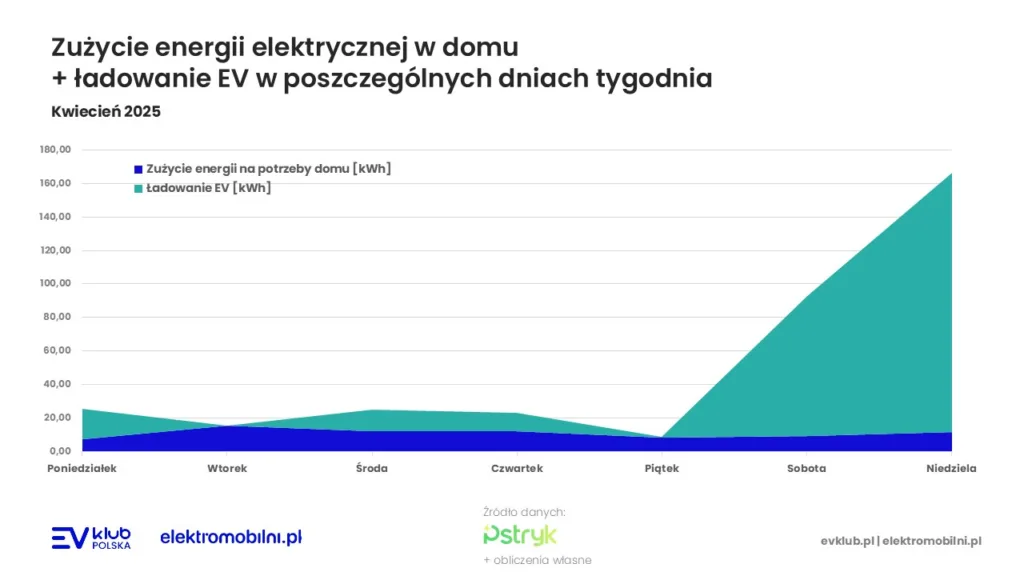 Prawdziwą rewolucją w kosztach okazało się ładowanie samochodów elektrycznych w taryfie dynamicznej w kwietniu. Z 357 kWh całkowitego zużycia, aż 280 kWh (78%) pobrano na ładowanie pojazdów, a pozostałe 77 kWh (22%) na potrzeby domu (pozostała energia – 116 kWh została dostarczona przez instalację fotowoltaiczną).