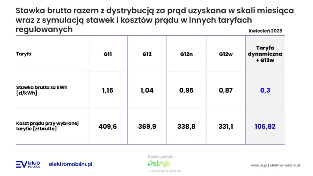 Biorąc pod uwagę całkowite zużycie 357 kWh w kwietniu (dom + ładowanie aut), średnia stawka brutto (razem z dystrybucją, opłatą dla Pstryka i podatkami) wyniosła 0,30 zł/kWh. To wynik znacznie lepszy od wszystkich taryf regulowanych.
