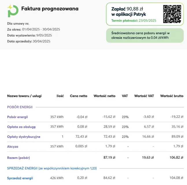 W kwietniu sprzedałem 426 kWh po średniej cenie 0,20 zł netto za kWh, co dało przychód 104 zł trafiający do depozytu prosumenckiego.