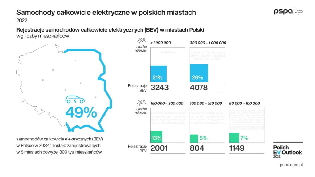 Elektromobilność w Polsce nadal koncentruje się przede wszystkim w największych ośrodkach miejskich. Z pierwszego wydania „Polish EV Outlook 2023” wynika, że najwięcej samochodów całkowicie elektrycznych – prawie 22% całej polskiej floty – zarejestrowano w Warszawie. W 2022 r. stolica odpowiadała również za ponad 21% nowych rejestracji BEV w Polsce. Ok. 26% polskiego parku samochodów całkowicie elektrycznych zarejestrowano w miastach liczących od 300 tys. do 1 mln mieszkańców – Krakowie, Łodzi, Wrocławiu, Poznaniu, Gdańsku, Szczecinie, Bydgoszczy i Lublinie. Flota w mniejszych ośrodkach miejskich, o liczbie mieszkańców od 150 tys. do 300 tys., stanowi 12% łącznej liczby BEV w Polsce. Natomiast udział miast, których liczba mieszkańców wynosi od 50 do 150 tys. osób, wynosi ok. 5%.