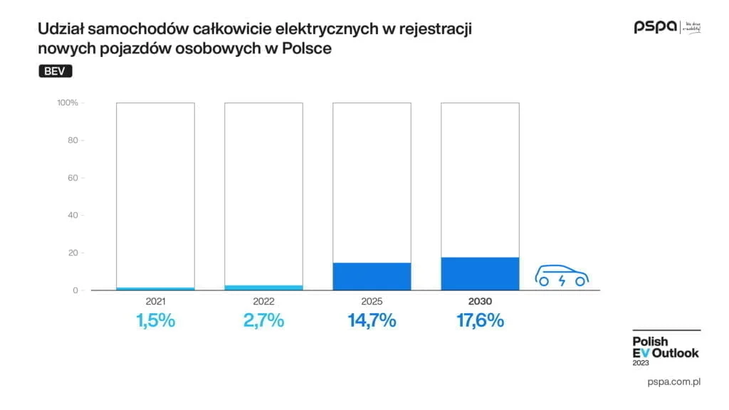 – W prognozie zaprezentowanej w poprzednim wydaniu „Polish EV Outlook” udało nam się z prawie stuprocentową dokładnością przewidzieć liczbę nowo zarejestrowanych samochodów całkowicie elektrycznych na koniec 2022 r. W scenariuszu realistycznym nasza estymacja różniła się od wyniku rzeczywistego o zaledwie 85 szt. Margines błędu wyniósł ok. 0,5%. Liczymy na to, że liczby ujęte w prognozach przedstawionych w „Polish EV Outlook 2023” również będą możliwie zbliżone do ostatecznego rezultatu w segmencie elektromobilności, który odnotujemy w Polsce w 2023 r. W kolejnych latach polski sektor e-mobility zdecydowanie przyspieszy. Zakładamy, że do 2030 r. łączna liczba nowo rejestrowanych (pochodzących z rynku krajowego i importu) w Polsce samochodów całkowicie elektrycznych (osobowych i dostawczych) zwiększy się do prawie 170 tys. szt. Podobny poziom rejestracji nowych, osobowych BEV jak w Belgii, Hiszpanii, czy we Włoszech w 2022 r. osiągniemy już w 2024 r., natomiast do ubiegłorocznego wyniku Niderlandów zbliżymy się w 2025 r. – powiedział Maciej Mazur, dyrektor zarządzający PSPA.
