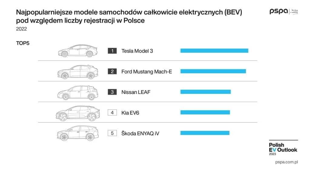 – Wśród najchętniej kupowanych przez Polaków modeli BEV w 2022 r. znalazły się Tesla Model 3, Ford Mustang Mach-E oraz Nissan Leaf. W 2022 r. w polskiej ofercie pojawiło się 18 nowych modeli samochodów całkowicie elektrycznych. Co istotne, średni zasięg debiutujących modeli osobowych przekroczył 500 km, a średnia, maksymalna moc ładowania – 150 kW. Na rok 2023 zaplanowano ponad 30 kolejnych premier samochodów całkowicie elektrycznych – powiedział Albert Kania, Senior New Mobility Manager PSPA.