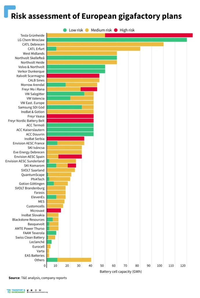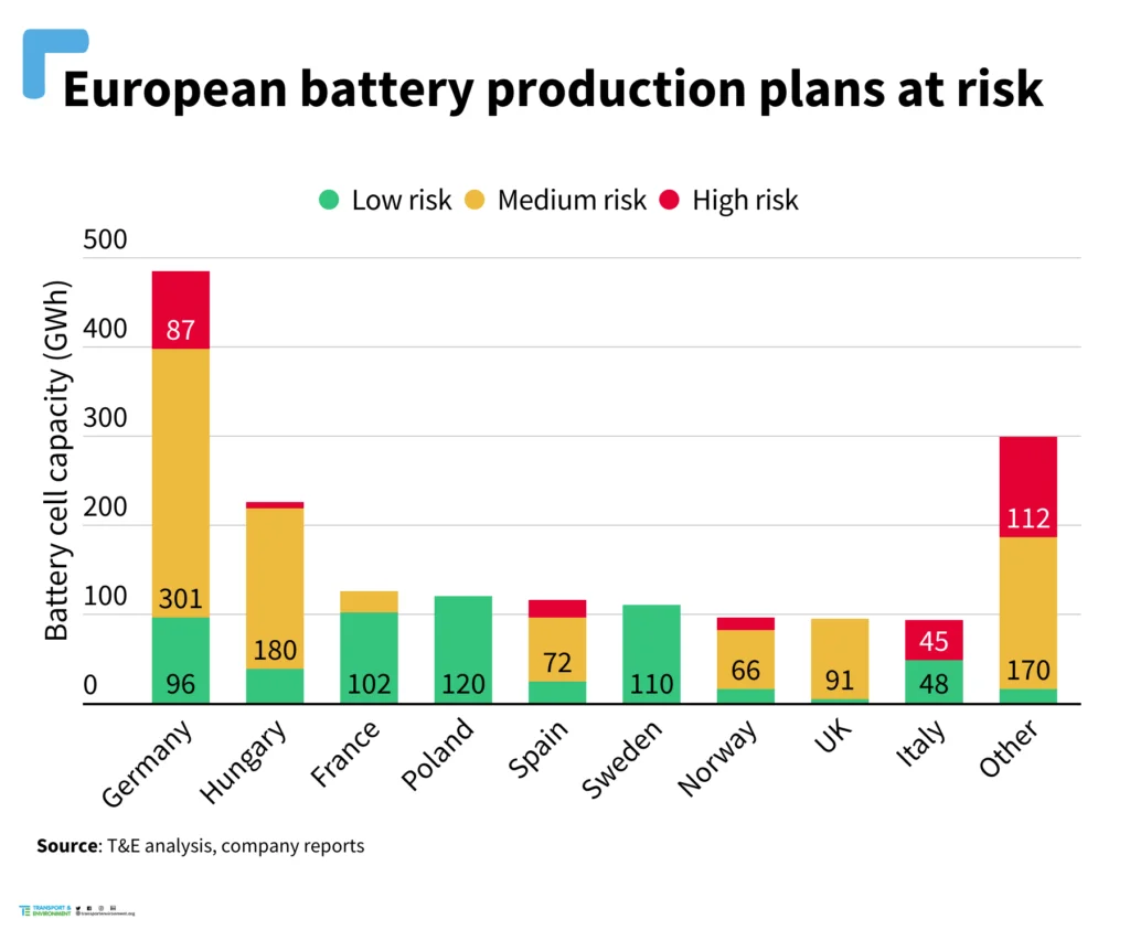 Niemcy, Węgry, Hiszpania, Włochy i Wielka Brytania mogą stracić najwięcej, jeśli producenci baterii zmienią swoje plany. Fabryka Tesli Giga Berlin ma największe wolumeny zagrożone opóźnieniem w Europie po tym, jak firma powiedziała, że skoncentruje produkcję ogniw w USA, aby skorzystać z zachęt wynikających z ustawy o redukcji inflacji. Istnieje średnie ryzyko dla planowanej gigafabryki Northvolt w Heide w Niemczech, ponieważ firma zabezpieczyła tylko część finansowania i nie rozpoczęła budowy. Ponadto dyrektor generalny Northvolt powiedział w październiku ubiegłego roku, że może opóźnić zakład i nadać priorytet rozbudowie w USA.