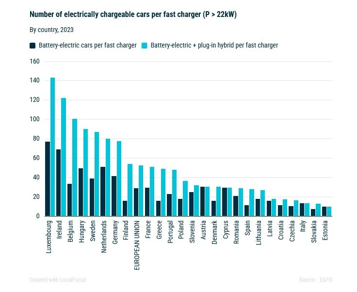 Ponieważ w UE obserwuje się wzrost popularności pojazdów typu BEV, coraz bardziej kluczowa staje się dostępność i strategiczne rozmieszczenie publicznych szybkich ładowarek wzdłuż autostrad. Obecnie na drogach UE porusza się około 3 miliony pojazdów typu BEV, a dostępnych jest około 75 000 publicznych stacji szybkiego ładowania (przynajmniej jeden punkt DC). Przekłada się to na stosunek około 30 BEV na każdą szybką ładowarkę. Jeśli policzymy hybrydowe pojazdy elektryczne typu plug-in (PHEV), które również korzystają z tej samej infrastruktury ładowania, wskaźnik ten wzrasta do około 52 samochodów na jedną szybką ładowarkę.