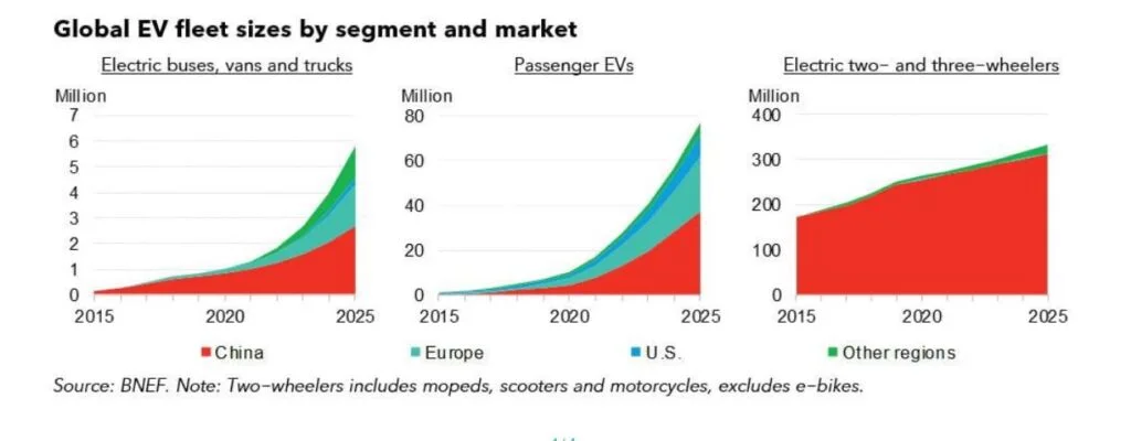 Obecnie elektryfikacja także w innych segmentach również nabiera tempa. Na przykład w Chinach jeździ obecnie 685 000 autobusów elektrycznych i 195 milionów elektrycznych jednośladów, a 17% sprzedaży lekkich samochodów dostawczych w Korei Południowej w 2021 r. było elektrycznych. Prawie 40% trójkołowej floty Indii jest już elektryczne