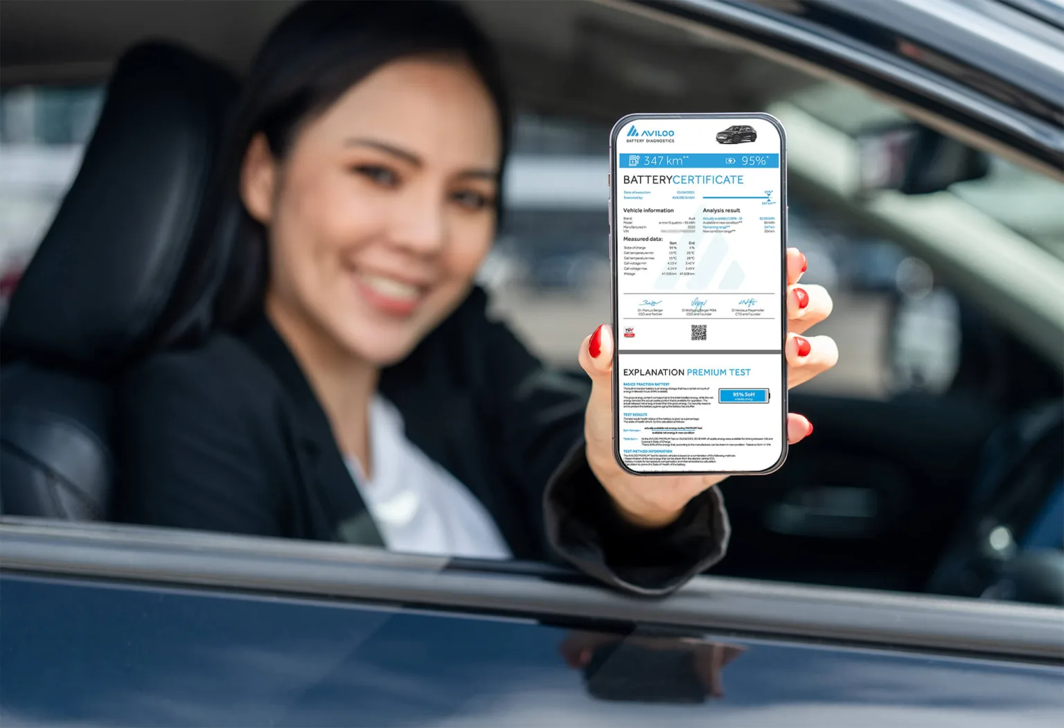 Efektem jest certyfikat Aviloo: rzeczywista pojemność (kWh), SoH, analiza balansu ogniw, identyfikacja anomalii oraz benchmark względem podobnych pojazdów. Dokument można zweryfikować online i dołączyć do ogłoszenia lub umowy.
