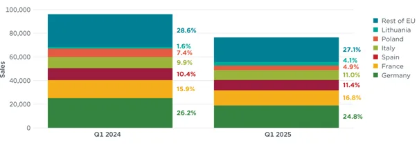 Mimo tak obiecujących wyników w elektromobilności, europejski rynek pojazdów ciężkich jako całość odnotował spadek sprzedaży – w I kwartale 2025 roku sprzedano 75 000 pojazdów, wobec 95 000 rok wcześniej.