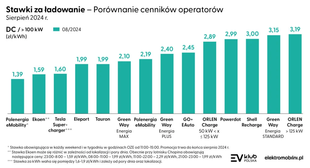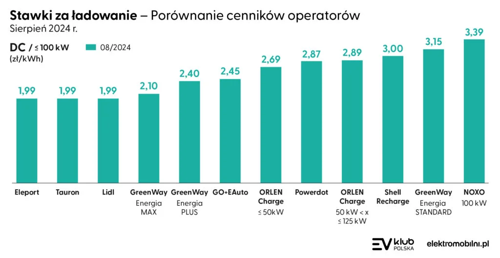 ORLEN Charge oferuje ładowanie (powyżej 125 kW) w cenie 3,19 PLN za kWh. Szybkie ładowanie DC (od 50 kW do 125 kW) 2,89 PLN/kWh a (do 50 kW) to 2,69 PLN/kWh. Powerdot podwyższył również stawkę DC i obecnie wynosi ona 2,99 PLN za kWh na stacjach DC. Eleport oferuje promocyjną stawkę do końca sierpnia wynoszącą 1,99 PLN za kWh, wcześniej cena wynosiła 3,00 PLN za kWh. Tauron z kolei wyróżnia się stawką 1,99 PLN za kWh dla zarejestrowanych użytkowników, a dla gości cena wynosi 2,31 PLN za kWh.