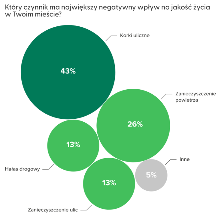 Efektem takiego stanu jest pogarszająca się jakość życia, zwłaszcza w dużych aglomeracjach miejskich. Polacy wskazują, że najbardziej dokuczliwe są zatory drogowe (43%) oraz zanieczyszczenie powietrza (26%), a ponadto nadmierny hałas i zanieczyszczenie ulic (po 13%). W każdym z ww. obszarów wdrożenie strefy czystego transportu jest w stanie w sposób istotny przyczynić się do poprawy jakości życia mieszkańców.