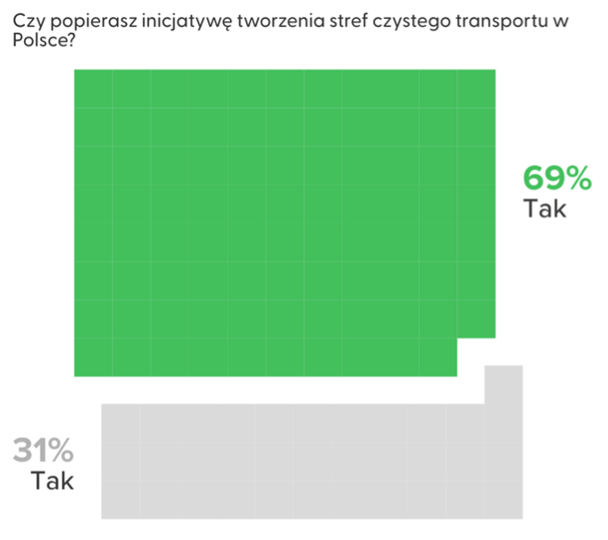 Co ważne, po przedstawieniu badanym pełnego zakresu informacji o strefach czystego transportu, aż 69% wyraziło aprobatę dla powstawania SCT w polskich miastach. Wynik ten wskazuje, jak ważna jest edukacja i dialog ze społeczeństwem w trakcie przygotowywania projektów wdrażania stref.