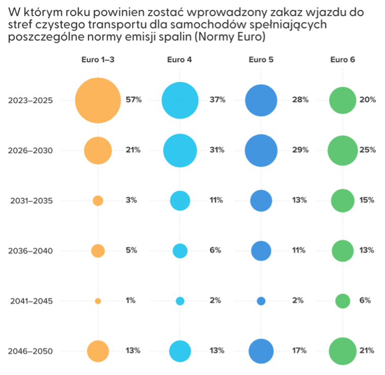 Większość Polaków (70%) oczekuje, aby strefy czystego transportu powstawały w sposób progresywny (tzn. wykluczający pojazdy niespełniające wskazanych norm emisji spalin), zgodnie z określonym harmonogramem. Na podstawie przeprowadzonego badania, uwzględniając głosy większości respondentów (ponad 50% wskazań), pojazdy spełniające dane normy EURO powinny być wykluczane zgodnie z następującym wzorcem: