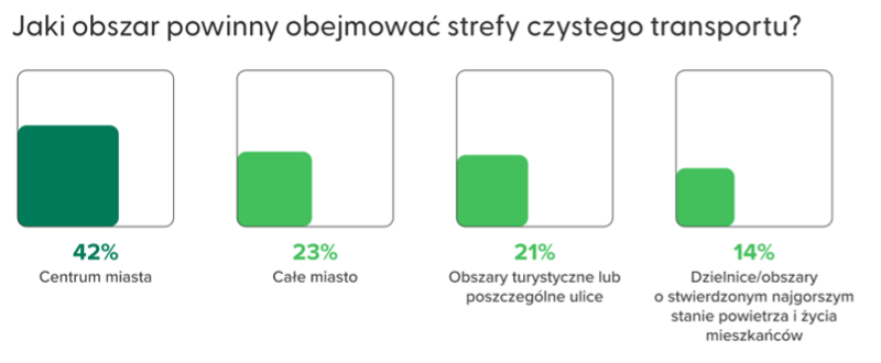 Strefy czystego transportu, zdaniem większości Polaków (42%), powinny obejmować wyłącznie obszary centrów miast. Zdaniem 23% respondentów ograniczeniami wjazdu powinny zostać objęte całe miasta, natomiast co piąty badany (21%) wskazał na wybrane ulice bądź obszary turystyczne.