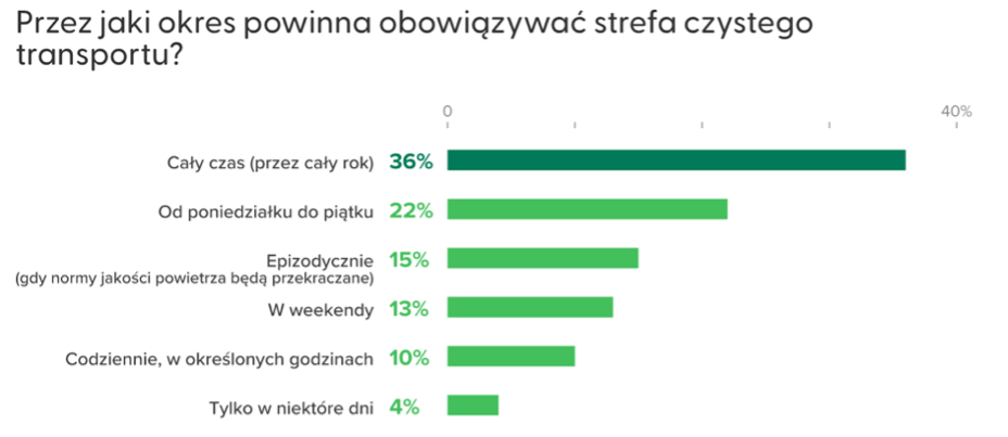Polacy prezentują również odmienne spojrzenie względem okresu, w jakim ograniczenia wjazdu do stref czystego transportu powinny mieć miejsce. Większość (36%) opowiada się za funkcjonowaniem SCT bez przerw i wyjątków, przez cały rok. 22% wskazało na tydzień pracy tzn. od poniedziałku do piątku, przy czym ograniczenia nie obowiązywałby w weekendy. 15% badanych funkcjonowanie obszarów niskiej lub zerowej emisji chciałoby powiązać ze stanem jakości powietrza, 13% zgadza się na ograniczenia w weekendy, a co dziesiąty badany (10%) wskazuje na system godzinowy, gdzie przykładowo strefa obowiązywałaby w godzinach 8:00 – 18:00, analogicznie do stref płatnego parkowania.