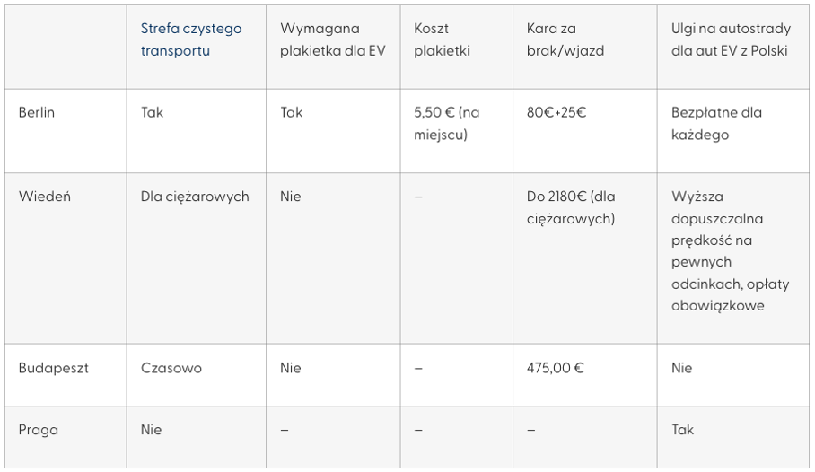 Samochodów elektrycznych przybywa. Zwiększają się też systematycznie ich zasięgi. Polscy elektromobilni coraz częściej decydują się na dalsze wycieczki, nie tylko w obrębie naszego kraju, ale też daleko poza jego granicami. Warto wiedzieć jak poruszać się elektrykiem za granicą i jakie zasady obowiązują u naszych bliższych i nieco dalszych sąsiadów, zarówno w miastach oraz na drogach. Wiedza przyda się, by uniknąć przykrych niespodzianek, które mogą skutkować odchudzeniem naszego portfela. Pod „lupę” wzięliśmy Niemcy, Austrię, Węgry i Czechy oraz stolice tych państw, które są popularnymi destynacjami naszych bezemisyjnych globtroterów. W drogę!