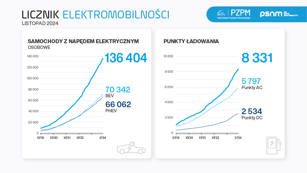 Pod koniec listopada 2024 r. po polskich drogach jeździły 136 404 samochody osobowe z napędem elektrycznym. Flota w pełni elektrycznych, osobowych aut (BEV, ang. battery electric vehicles) liczyła 70 342 szt., a park hybryd typu plug-in (PHEV, ang. plug-in hybrid electric vehicles) – 66 062 szt. Liczba samochodów dostawczych i ciężarowych z napędem elektrycznym wynosiła 7 833 szt. Stale rośnie też flota elektrycznych motorowerów i motocykli, która na koniec listopada składała się z 23 252 szt., jak również liczba osobowych i dostawczych aut hybrydowych, która powiększyła się do 926 714 szt. Pod koniec ubiegłego miesiąca park autobusów zeroemisyjnych w Polsce wzrósł do 1 442 szt. (z czego pojazdy całkowicie elektryczne stanowiły 1358 szt., zaś wodorowe – 84 szt.).