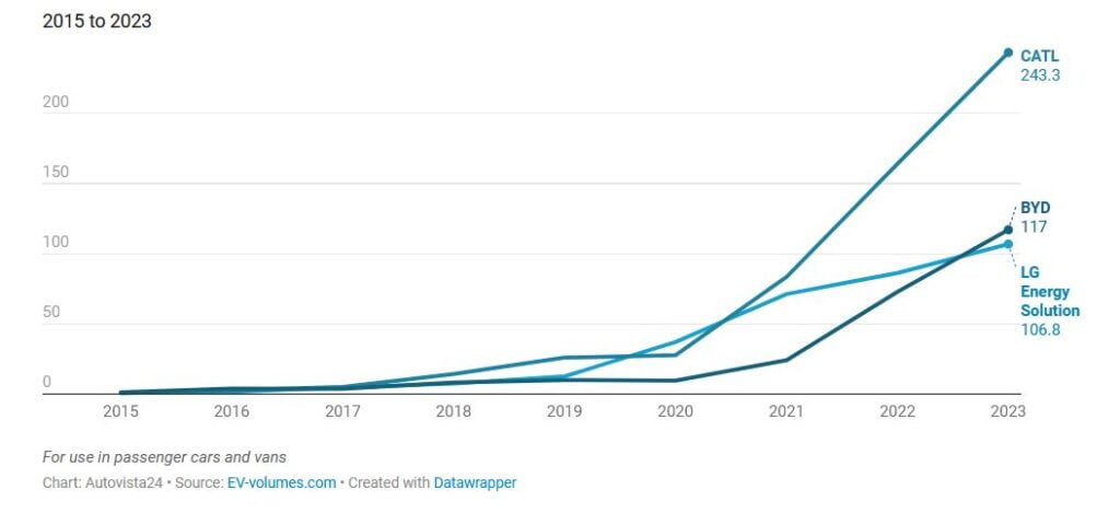 Na trzecim miejscu, z pojemnością 106,8 GWh produkcji ogniw, znalazła się firma LG Energy Solution. Oznaczało to dla niej wzrost o 16% w stosunku do produkcji w 2022 roku. W sumie producent zgarnął 16% rynku baterii elektrycznych w 2023 roku. Duży w tym wyniku udział ma zakład mieszczący się w Polsce. Pod Wrocławiem LG Energy Solution wybudowało największą fabrykę baterii do samochodów elektrycznych w Europie. Powstają tam baterie, które zasilają samochody takich marek, m.in.: Audi, BMW, Fiat, Ford, Porsche i Volkswagen.