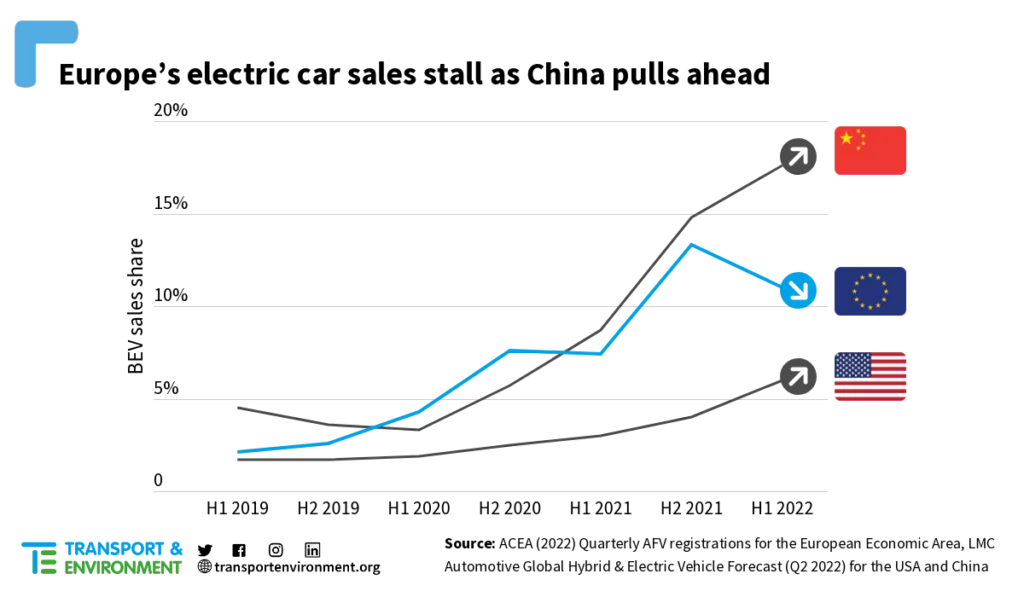 Według przedstawionych przez T&E danych, udział sprzedaży samochodów elektrycznych w Europie spadł do 11 proc. w pierwszej połowie 2022 roku, co oznacza kolejny spadek z 13 proc. w drugiej połowie ubiegłego roku. Rosnąca sprzedaż pojazdów elektrycznych w Stanach Zjednoczonych i Chinach sugeruje, że brak zachęt regulacyjnych, a nie załamanie łańcucha dostaw, jest główną przyczyną powolnych wysiłków Europy w zakresie elektryfikacji – twierdzi T&E. W tym samym czasie (pierwsza połowa 2022 r.) sprzedaż BEV w Chinach wzrosła do prawie 18 proc. na rynku nowych samochodów, podczas gdy udział EV w USA wzrósł o 50 proc. W tym samym okresie udział BEV w Europie spadł o dwa punkty procentowe, przy czym Europejczycy borykają się z wyjątkowo długim czasem oczekiwania na modele elektryczne.