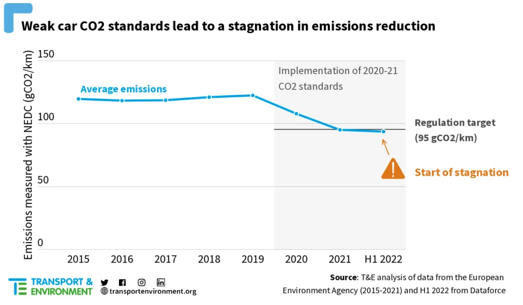 Po spadku średnich emisji dwutlenku węgla (CO2) z nowych samochodów w Europie po wprowadzeniu ambitnych norm CO2 na 2020/21 rok (12 proc. zarówno w 2020, jak i 2021 roku), emisja CO2 z samochodów w UE spadła o zaledwie 2 proc. w pierwszej połowie tego roku. Dzieje się tak dlatego, że cele są zbyt słabe – twierdzi T&E. Pomimo stagnacji sprzedaży BEV, wszyscy oprócz VW są na dobrej drodze do osiągnięcia celu CO2 na rok 2022.