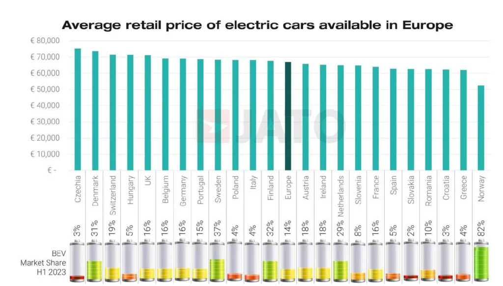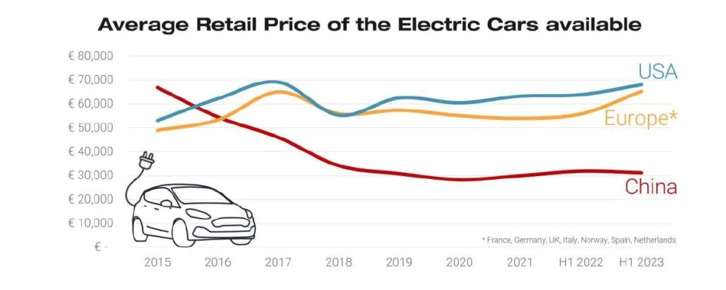 W 2023 roku średnia cena detaliczna samochodu elektrycznego dostępnego w Chinach jest już o ponad połowę niższa niż w Europie i USA. W I półroczu 2023 r. samochód elektryczny kosztował 31 165 euro w Chinach, 66 864 euro w Europie (+115% w porównaniu z Chinami) i 68 023 euro w USA (+118% w porównaniu z Chinami).