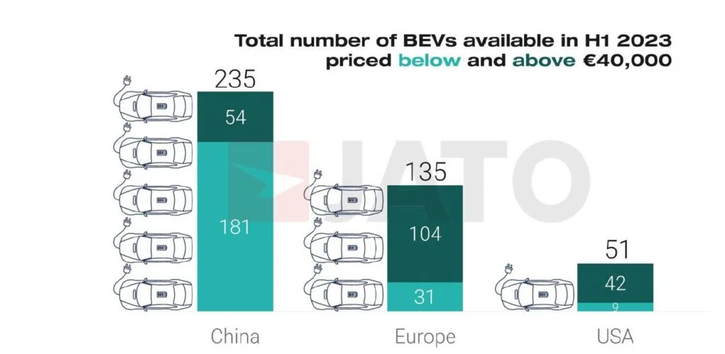 W 2022 roku Chiny skoncentrowały się na produkcji szeregu modeli w wielu segmentach, podczas gdy „reszta świata” nadal swoją uwagę skupiała na segmencie samochodów elektrycznych z wyższej półki. W rezultacie Chinom udało się nie tylko obniżyć średnią cenę swojej oferty pojazdów elektrycznych, ale także utrzymać niskie ceny. Podobne auto kosztowało odpowiednio: 55 821 euro w Europie (o 75% więcej w porównaniu z Chinami) i 63 864 euro (+101% w porównaniu z Chinami) w USA.