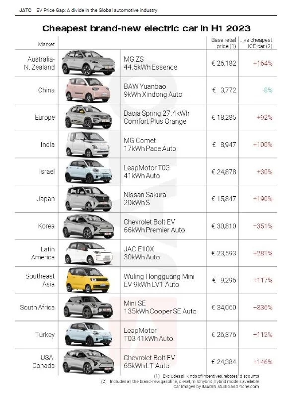 Podczas gdy producenci w innych częściach świata dokładają starań, aby produkować bardziej przystępne cenowo pojazdy elektryczne, nadal są one drogie w porównaniu z pojazdami benzynowymi i wysokoprężnymi. Aby kupić pojazd elektryczny, konsumenci musieliby wydać co najmniej 18 285 euro w Europie i 24 400 euro/26 500 euro w USA. Jest to odpowiednio o 92% i 146% droższej niż zapłaciłyby za najtańszy dostępny samochód spalinowy. Natomiast najtańszy pojazd elektryczny dostępny w Chinach jest o 8% tańszy niż najtańszy samochód spalinowy.