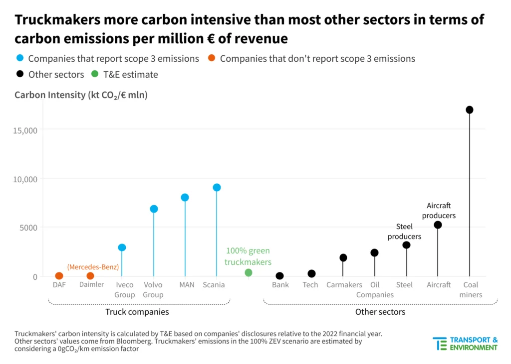 Producenci samochodów ciężarowych już teraz są inwestycją bardziej emisyjną niż inne gałęzie przemysłu powodujące duże zanieczyszczenie, takie jak ropa naftowa i stal, pod względem zgłaszanej emisji dwutlenku węgla na euro przychodu. Jedynym sektorem, jaki udało się znaleźć analitykom T&E, w którym średnia intensywność emisji dwutlenku węgla jest wyższa niż w przypadku producentów ciężarówek, jest wydobycie węgla.