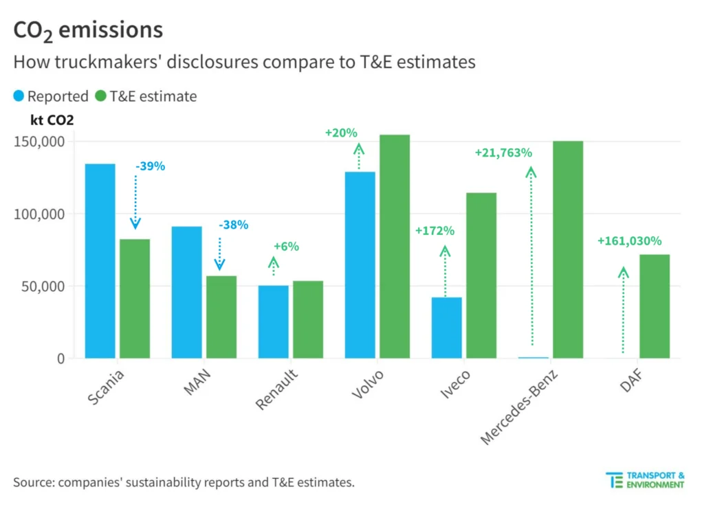 Analiza przeprowadzona przez T&E pokazuje, że Mercedes-Benz i DAF nie zgłaszają w całości swoich emisji w zakresie 3. IVECO zgłasza jedynie około jednej trzeciej emisji w zakresie 3. Także Renault i Volvo zaniżają swoje emisje. Jak dotąd jedynie raporty MAN i Scania są dokładne.