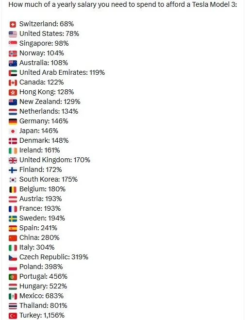 Opublikowane na Twitterze statystyki odnoszą się do procentowej wartości średniego wynagrodzenia przeznaczonej na zakup Tesli Model 3. Samochód ten został wybrany nieprzypadkowo. Obecnie jest to jeden z najbardziej popularnych (obok większego brata Y) modeli elektrycznych na świecie. Co ciekawe także w Polsce Tesla jest jednym z najchętniej wybieranych elektryków. Obecnie na portalu otomoto.pl dostępnych jest 19 – Tesli Model 3, w różnych konfiguracjach. Koszt to około 200 tys. zł. Warto zauważyć, że w salonie nowa „trójka” w podstawowej, jednonapędowej wersji kosztuje w Polsce ok. 203 tys. zł (niedługo ma się pojawić model 3 po liftingu – przyp. red.).
