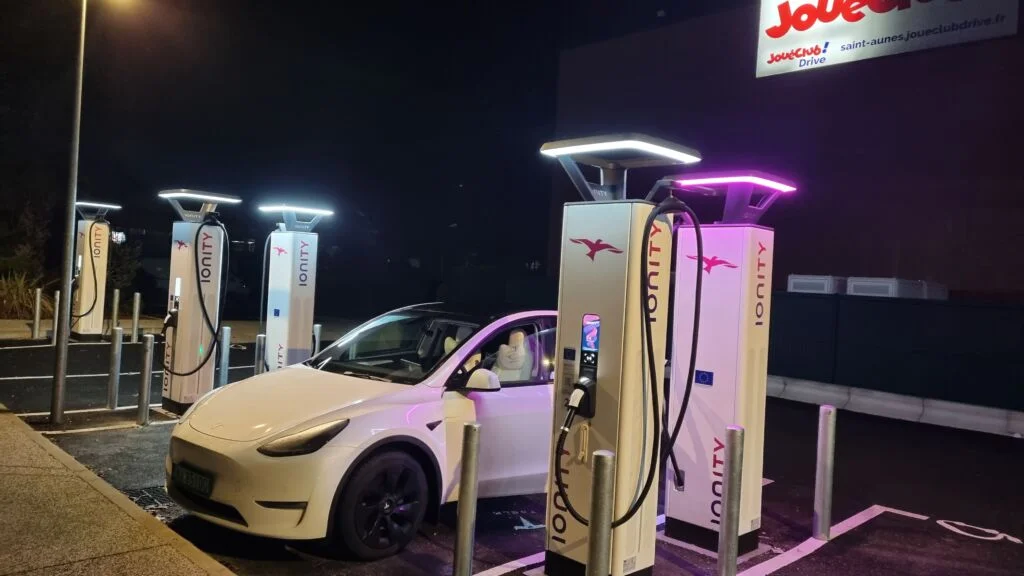 Francja. Pierwsze wyzwanie – Lyon – przejazd przez miasto, wigilia, bardzo duży ruch, przejeżdżaliśmy po godz. 18:00 – nie ma co ściemniać – umęczyliśmy się nieco. Drugie wyzwanie – stacje ładowania są umieszczane w centrach/kompleksach handlowych – w wigilie wieczorem wszystko było zamknięte na cztery spusty. Wszystko. Żadnego dostępu do toalety. Nawet stacje benzynowe funkcjonują w formule automatycznej. Poddaliśmy się – kupiliśmy nocleg w hotelu znajdującym się przy stacji ładowania – koszt 50 EUR. I nie było to fajne doświadczenie – wyciągnęliśmy wnioski i w drodze powrotnej chcemy konsekwentnie unikać hoteli i spać w aucie.