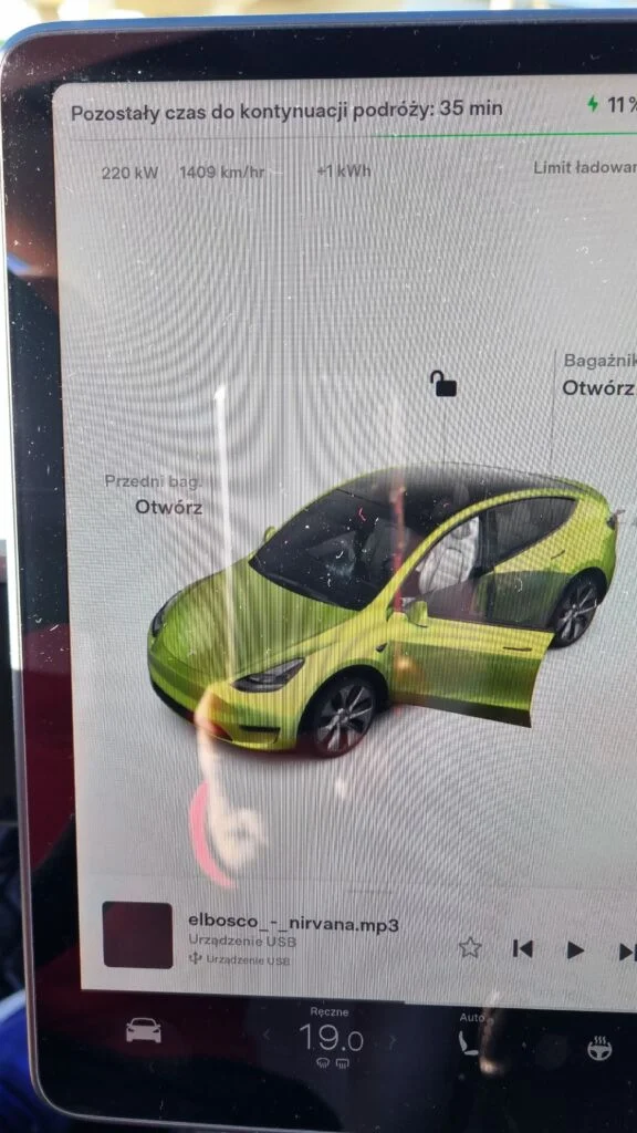 Kostomłoty – bateria była nagrzana i pusta (9%, około 50 km zasięgu), ale wszystkie stanowiska SuC były zajęte – byliśmy drudzy w kolejce w oczekiwaniu na wolne stanowisko. Dodatkowo ładowanie przy pełnym obłożeniu trwało dwukrotnie dłużej niż na pustej ładowarce ze względu na współdzielenie mocy dla wszystkich ładujących.