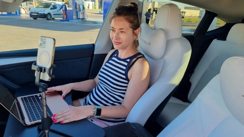 Zapomniałam wspomnieć o jednym, dość istotnym aspekcie naszej podróży. Myślę, że jakieś 90% trasy przejechaliśmy na tempomacie (adaptacyjnym) albo podstawowym autopilocie (tempomat + trzymanie pasa ruchu). W Tesli działa to super – dlatego prowadzenie auta było znacznie mniej wymagające niż klasyczne operowanie pedałami przyspieszenia i hamulca. Nasza obsługa samochodu ograniczała się do kontrolowania, czy automaty nie zachowują się dziwnie (typu nagłe hamowanie, przyspieszanie, brak hamowania za poprzedzającym pojazdem itp.) i ewentualnej zmiany pasów przy wyprzedzaniu. Odczuwalnie przełożyło się to na nasze poczucie zmęczenia po trasie – po pierwszej nocy w Hiszpanii w ogóle nie czuliśmy, że pokonaliśmy samochodem taki dystans.