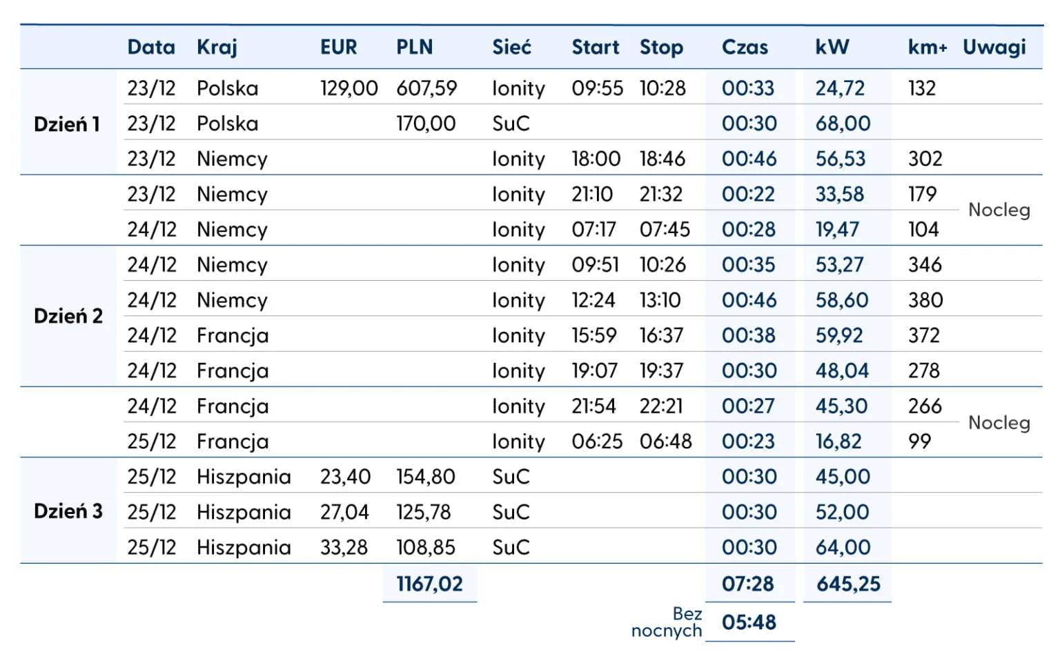 Średnie zużycie energii na całej trasie to 21 kWh/100 km (w PLN przy kosztach, które ponieśliśmy – JuicePass + SuC – to 39 PLN / 100 km – mówimy tu o ładowaniu w 100% na szybkich (powyżej 150 kW) ładowarkach komercyjnych) – szczegóły w excelu.