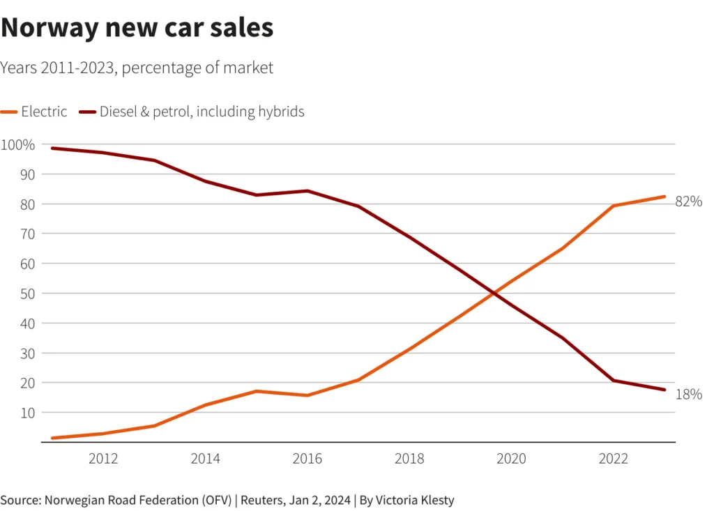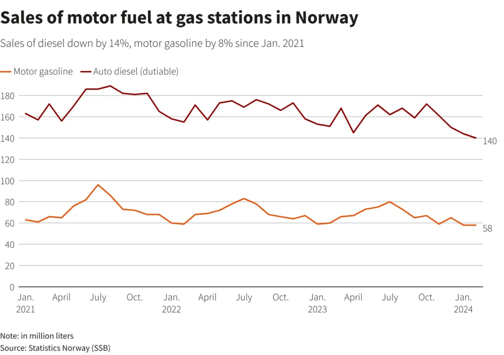 „Jeśli więcej krajów pójdzie za przykładem Norwegii, światowy popyt na ropę może osiągnąć szczyt wcześniej niż przewidywano. Międzynarodowa Agencja Energetyczna przewiduje, że szczyt ten nastąpi przed 2030 r., kiedy samochody osobowe i dostawcze będą odpowiadać za ponad 25% zapotrzebowania na ropę” – czytamy w analizie Reutersa.