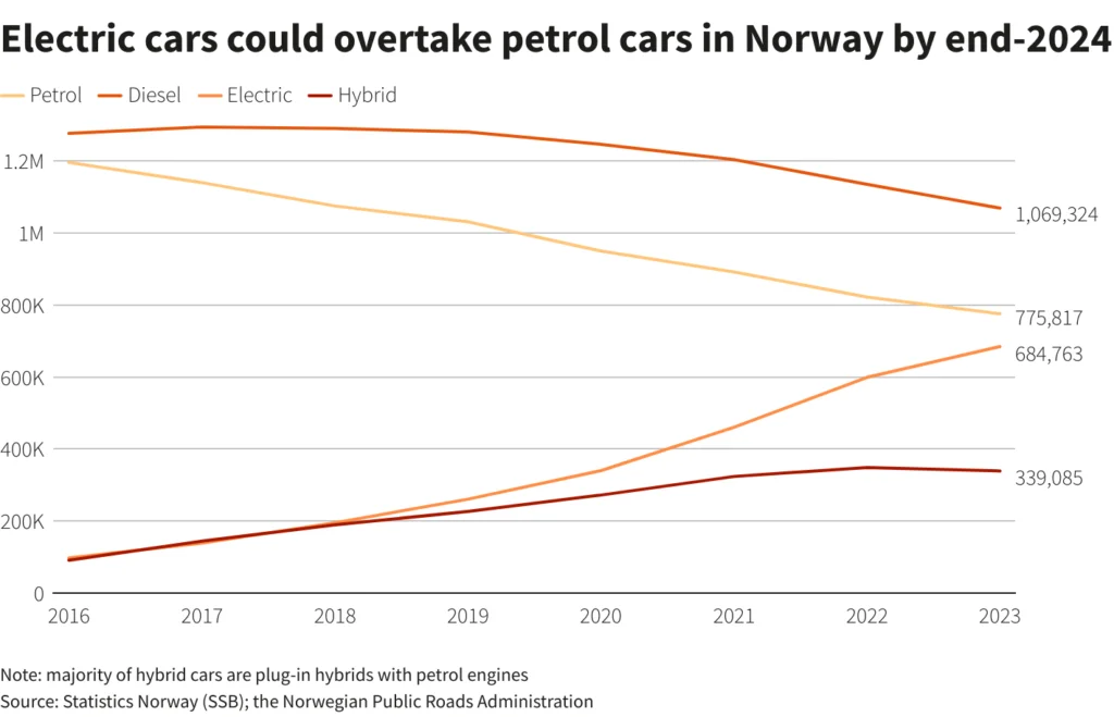 Reuters powołując się na dane Norweskiego Zarządu Dróg Publicznych (NPRA), wyliczył, że w marcu pojazdy z napędem BEV stanowiły 24,3% z 2,9 miliona samochodów w Norwegii, w porównaniu z 26,9% pojazdów benzynowych. Oznacza to, że teraz po norweskich drogach jeździ o 76 000 więcej aut napędzanych benzyną. Jeśli zestawić to liczbą 104 590 nowych pojazdów typu BEV sprzedanych w Norwegii w zeszłym roku (przy znikomej liczbie tych na benzynę) łatwo dojść do wniosku, że historyczny przełam musi nastąpić w przeciągu kilku lub kilkunastu miesięcy.