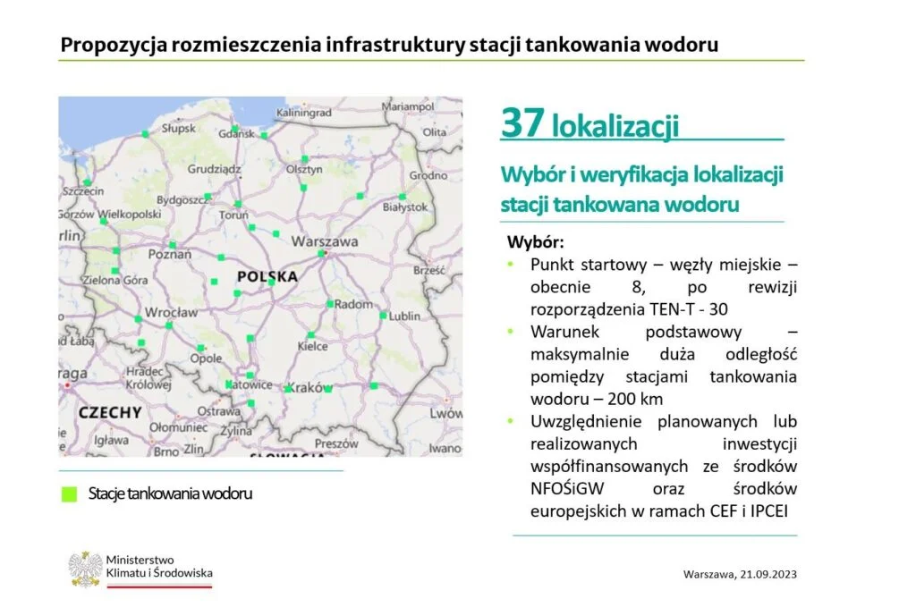 AFIR dotyczy także stacji tankowania wodoru. Gdzie zostaną umieszczone? GDDKiA wskazuje lokalizacje przy węzłach przy lub na terenie najważniejszych polskich aglomeracji. Maksymalna odległość między stacjami może wynosić 200 kilometrów. Wytypowano osiem lokalizacji na początek, ale w przyszłości ma być ich 37. Na liście znalazły się m.in. Częstochowa, Kraków, Warszawa, Poznań, Wrocław, Katowice, Gdańsk, Szczecin, a w przyszłości także m.in. Lublin, Olsztyn, Radom czy Opole.