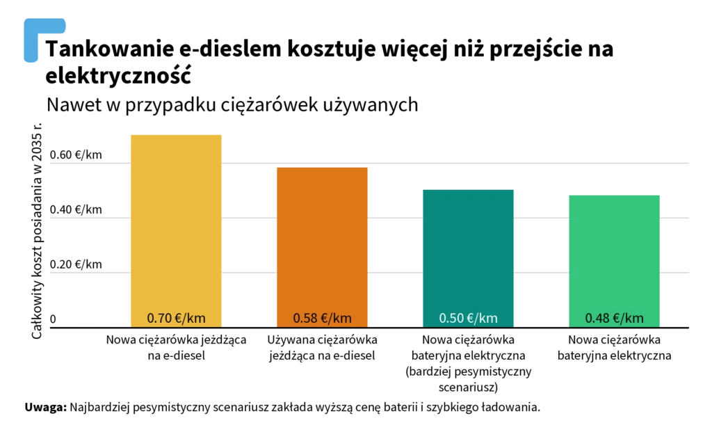 Do 2035 roku zakup i eksploatacja nowego dalekobieżnego samochodu ciężarowego z silnikiem wysokoprężnym na czysty e-diesel kosztowałyby o 47% więcej niż zakup i eksploatacja ciężarówki bateryjnej (BET)[1]. Wynika to z faktu, że niższe koszty energii i konserwacji ciężarówki elektrycznej szybko rekompensują jej wyższe koszty zakupu. Jednocześnie pojazdy napędzane e-paliwami byłyby znacznie droższe właśnie ze względu na wysoki koszt tych paliw.