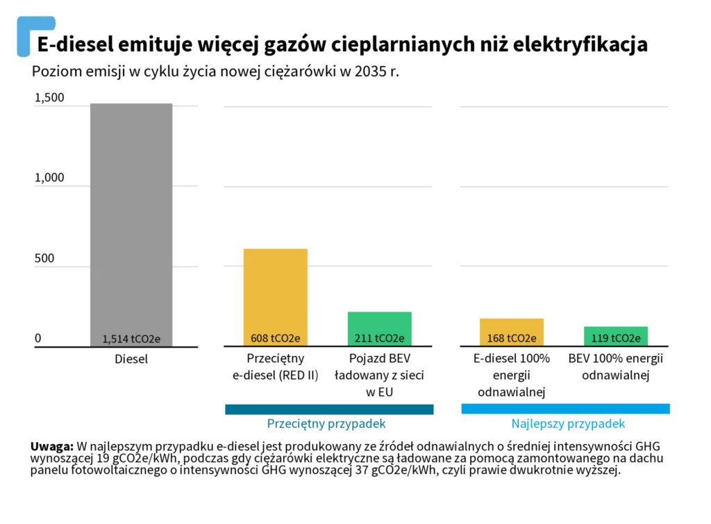 Badania pokazują[2], że typowa ciężarówka napędzana e-dieslem emitowałaby prawie trzy razy więcej CO2 w ciągu swojego okresu eksploatacji niż pojazd akumulatorowy zużywający średnią ilość energii elektrycznej. Nawet w najbardziej optymistycznym scenariuszu, zakładającym wykorzystanie do produkcji e-paliwa i ładowania pojazdów akumulatorowych wyłącznie energią ze źródeł odnawialnych j, ciężarówka jeżdżąca na e-diesel nadal emitowałoby 41% więcej. Pomimo wyższych emisji w procesie produkcji akumulatorów, e-paliwowe samochody ciężarowe emitują w ciągu swojego cyklu życia znacznie więcej gazów cieplarnianych niż ciężarówki akumulatorowo-elektryczne. Wynika to z faktu, emisje powstają w większości w trakcie jazdy, a samochody ciężarowe są pojazdami o wysokim przebiegu.
