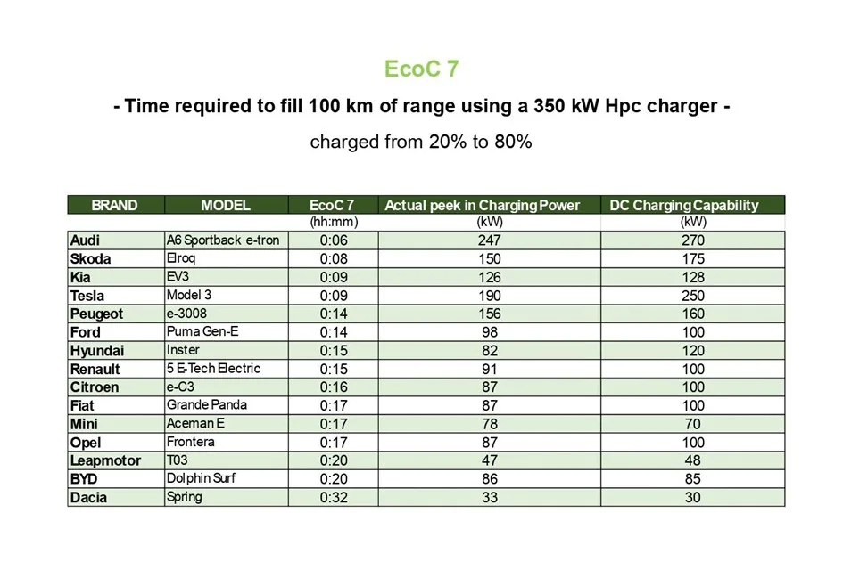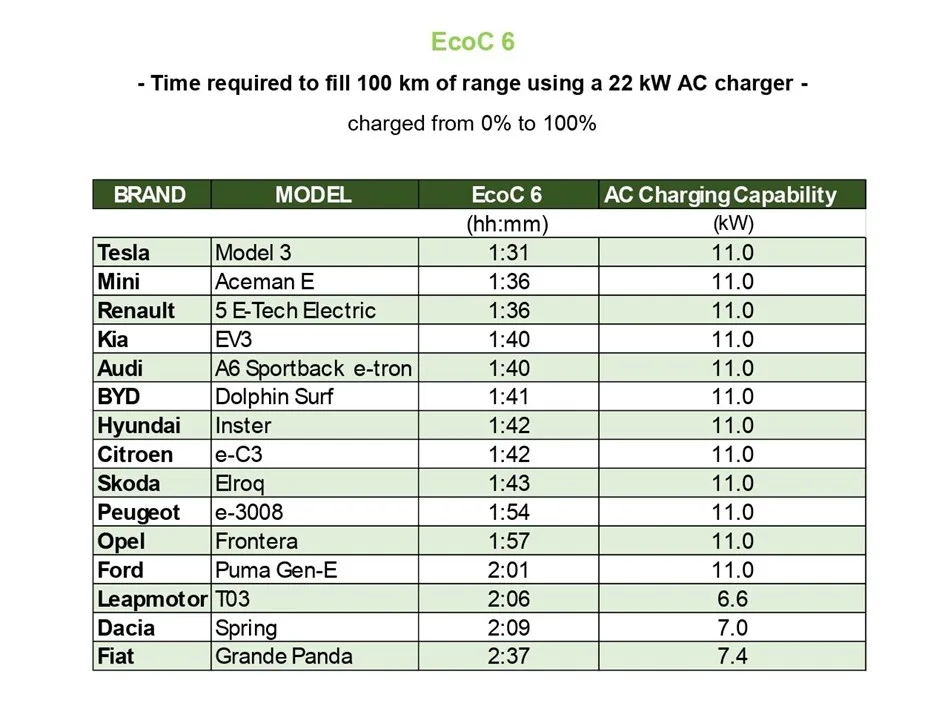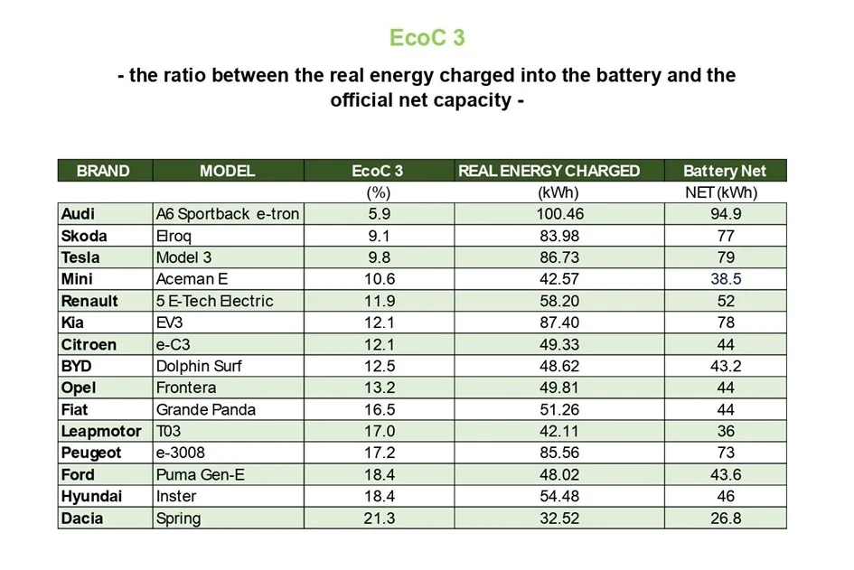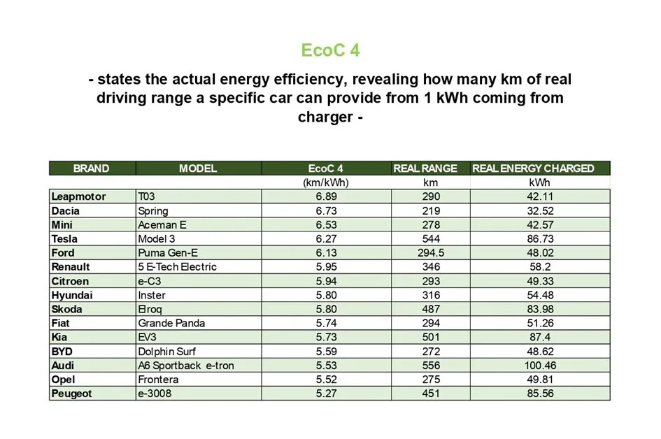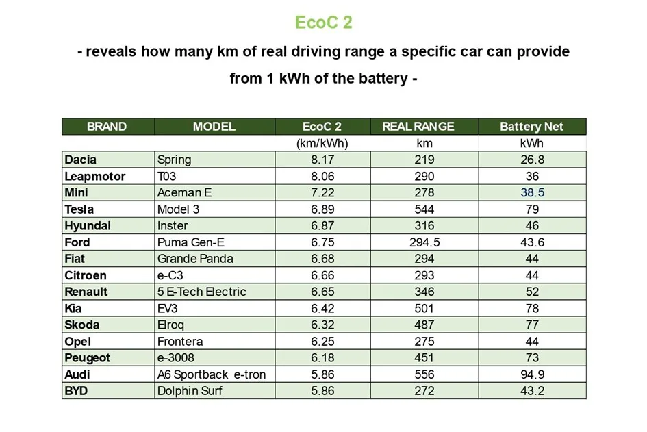 Jeszcze większe wrażenie robią dane dotyczące zużycia energii. Wskaźnik EcoC 2 pokazuje, ile kilometrów pojazd pokonuje na 1 kWh energii z akumulatora. Tu Dacia Spring pobiła własny rekord z 2021 roku, osiągając 8,17 km/kWh. Tuż za nią uplasował się ponownie Leapmotor T03 z wynikiem 8,06 km/kWh.