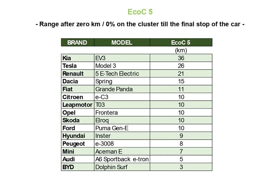 Warto zauważyć, że wszystkie testowane auta pokazały, że nawet po wyświetleniu zera na wskaźniku baterii trakcyjnej (dokładnie na wyświetlaczu deski rozdzielczej – przyp. red.), da się jeszcze przejechać kilka kilometrów. Najmniejsza rezerwa wyniosła 3 km (BYD Dolphin Surf), największa aż 36 km (Kia EV3).
