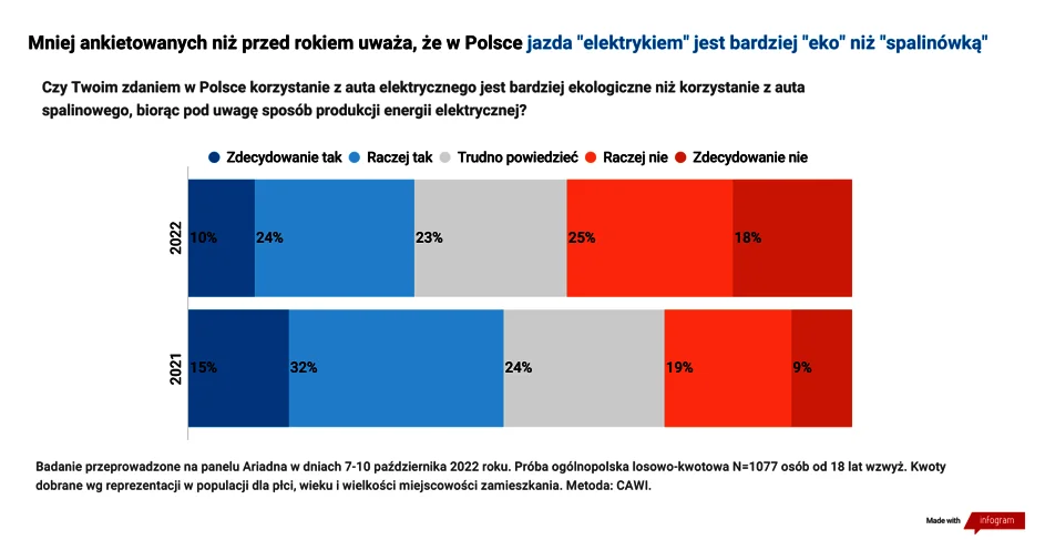 W badaniu z października 2022 r. 34% ankietowanych odpowiedziało, że samochody elektryczne są bardziej ekologiczne od aut spalinowych, także w realiach polskiego miksu energetycznego. W maju 2021 r. ten odsetek wynosił 47%, co oznacza spadek o 13 punktów procentowych. Niemal co czwarty badany (23%) nie miał wyrobionego zdania na ten temat, co było rezultatem niemal identycznym w porównaniu z 2021 r. (24%). Wynika z tego, że część głosów mówiących o ekologicznej przewadze „elektryków’ nad „spalinówkami” przeszła „na drugą stronę”. Jeśli w maju 2021 r. 28% ankietowanych twierdziło, że auta na prąd nie są bardziej ekologiczne niż spalinowe, to w ostatnim badaniu było ich aż 43%.