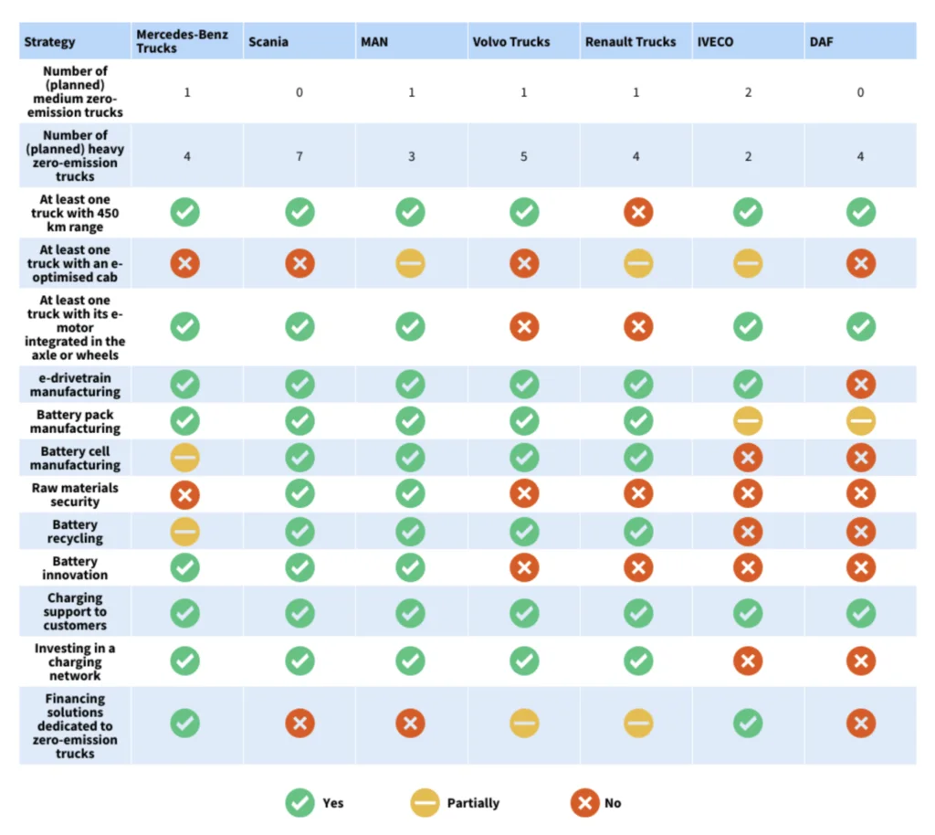 Natomiast DAF pozostaje w tyle z najsłabszymi wynikami wśród europejskich producentów samochodów ciężarowych. Ponieważ nie ma publicznego celu zeroemisyjnych samochodów ciężarowych (a rok 2030) i najniższy wynik w łańcuchu wartości akumulatorów, firma DAF musi ulepszyć swoje strategie, wyznaczyć jasne cele i skoncentrować się na rozwoju bezemisyjnych samochodów ciężarowych, aby dogonić liderów w branży.