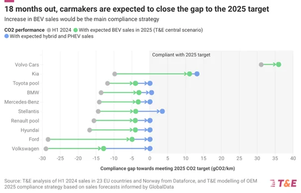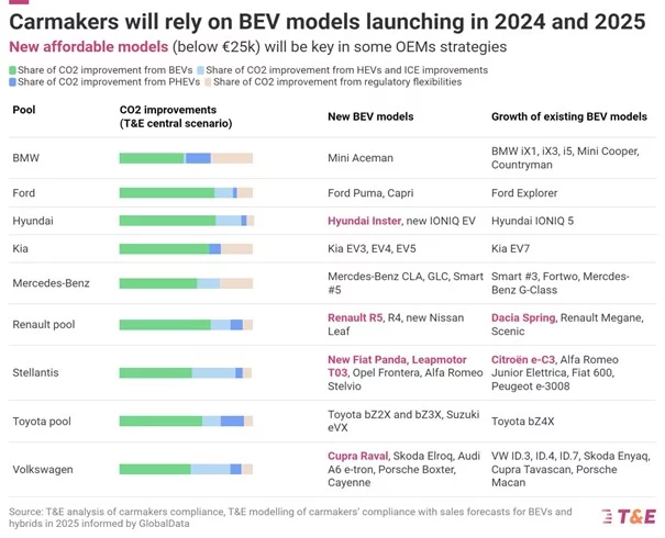 Jednak niektórzy producenci, w tym Stellantis i Volkswagen, nadal w dużej mierze bazują na hybrydach (HEV). Pojazdy hybrydowe mają stanowić odpowiednio 33% i 30% redukcji emisji CO2 obu flot. Z kolei dla Mercedesa i Renault hybrydy mają pokryć odpowiednio 17% i 15% wymaganej redukcji. BMW będzie zależne od hybryd typu plug-in, które mają dostarczyć 18% potrzebnej redukcji emisji – zwraca uwagę T&E.