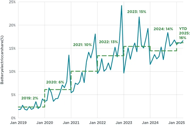 Grupa Volkswagena osiągnęła na przykład imponujące 19 proc., co oznacza aż 7 punktów procentowych więcej niż średnia z 2024 roku. Liderem w tej kategorii pozostaje BMW, którego BEV-y stanowiły 24 proc. wszystkich nowych rejestracji.